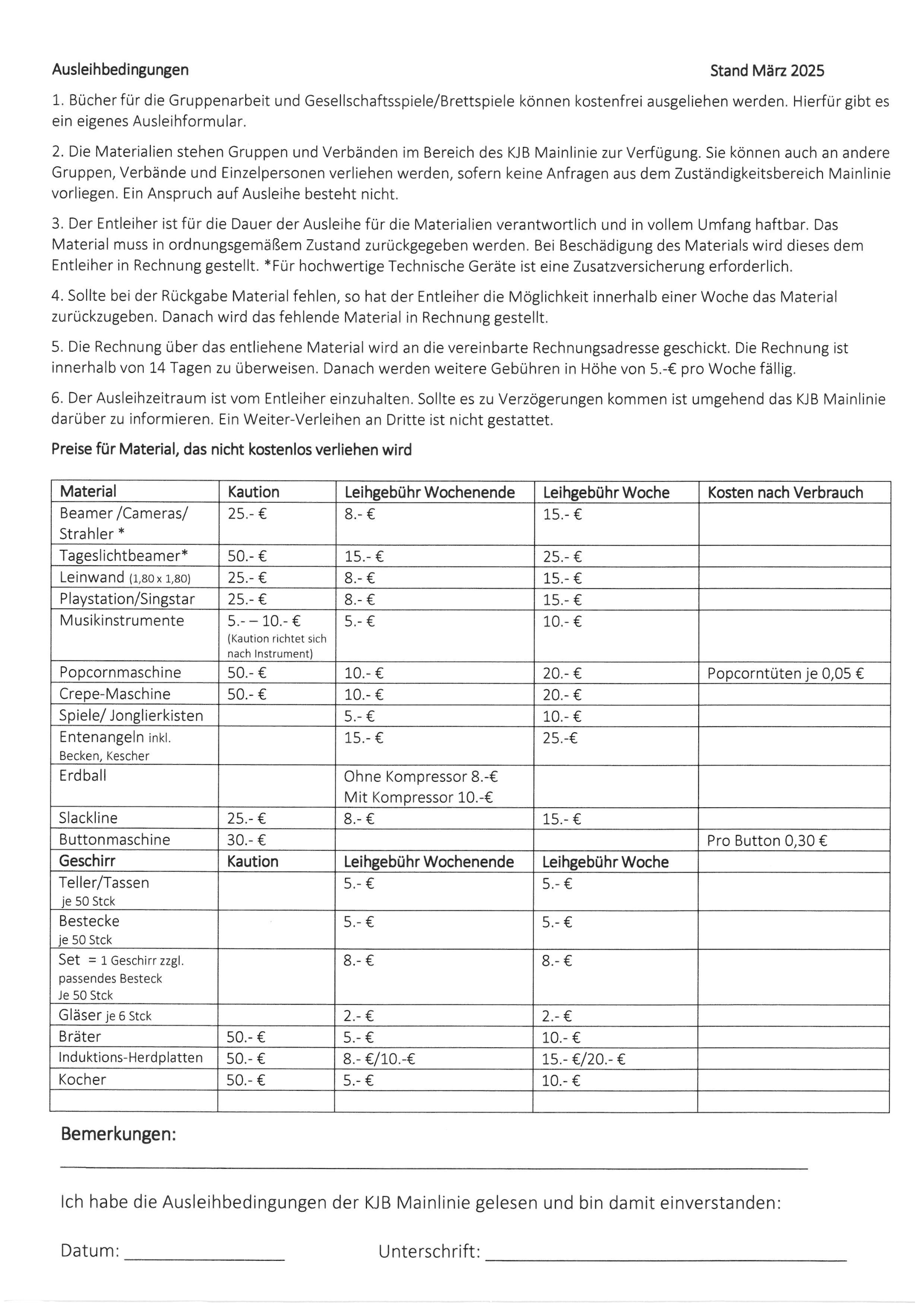 Die entsprechenden Gebühren / Verleihbedingungen findet ihr unten. Die Bezahlung erfolgt bar oder per Rechnung. Für den Bus und diverse technische Geräte ist eine Kaution hinterlegen. ( Siehe Ausleihbedingungen)