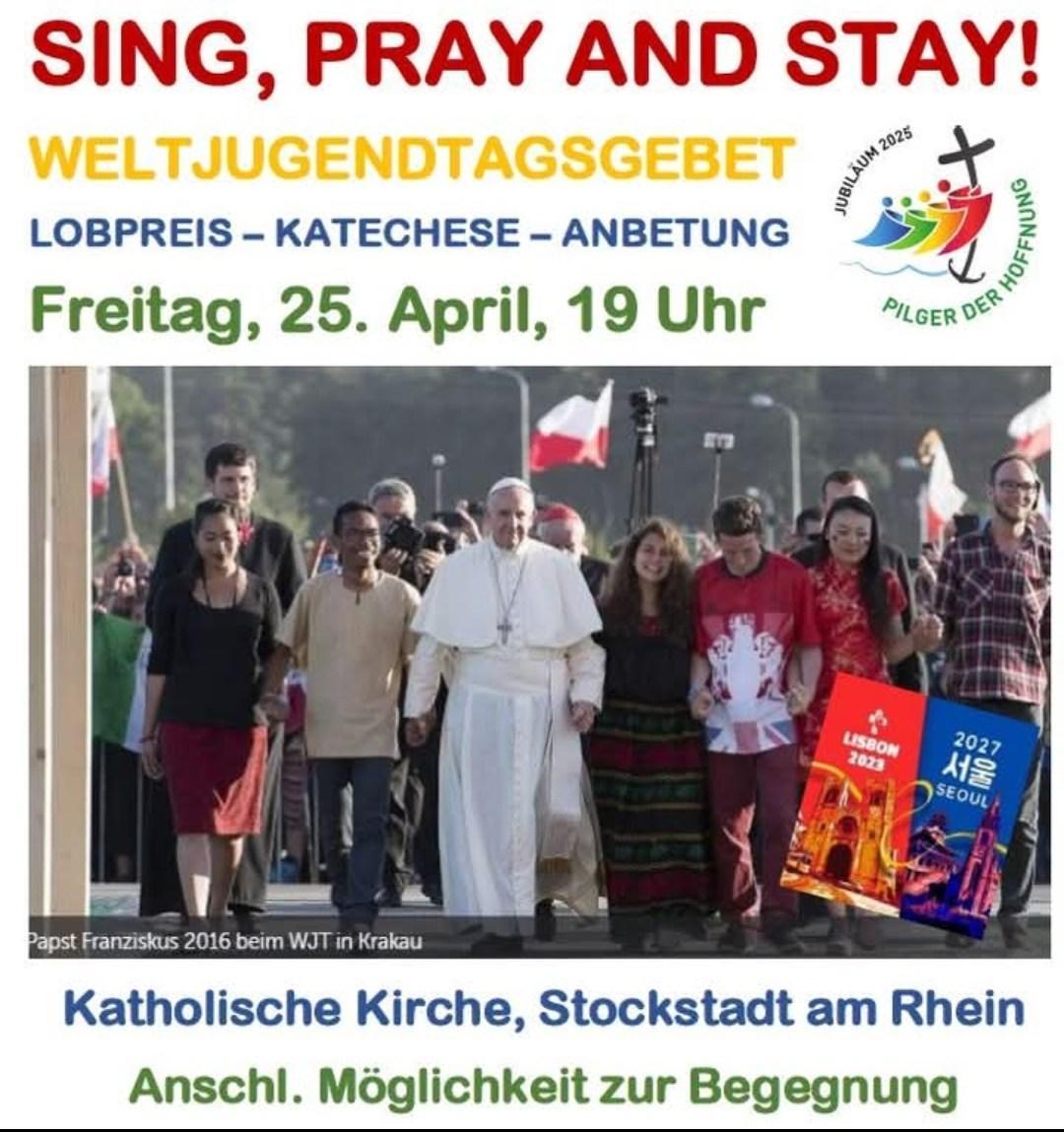Am Freitag, 23.05.2025, findet um 19:00 Uhr in Stockstadt das nächste WJT-Gebet "Sing, Pray and Stay" unter dem Motto "Pilger der Hoffnung" statt.
