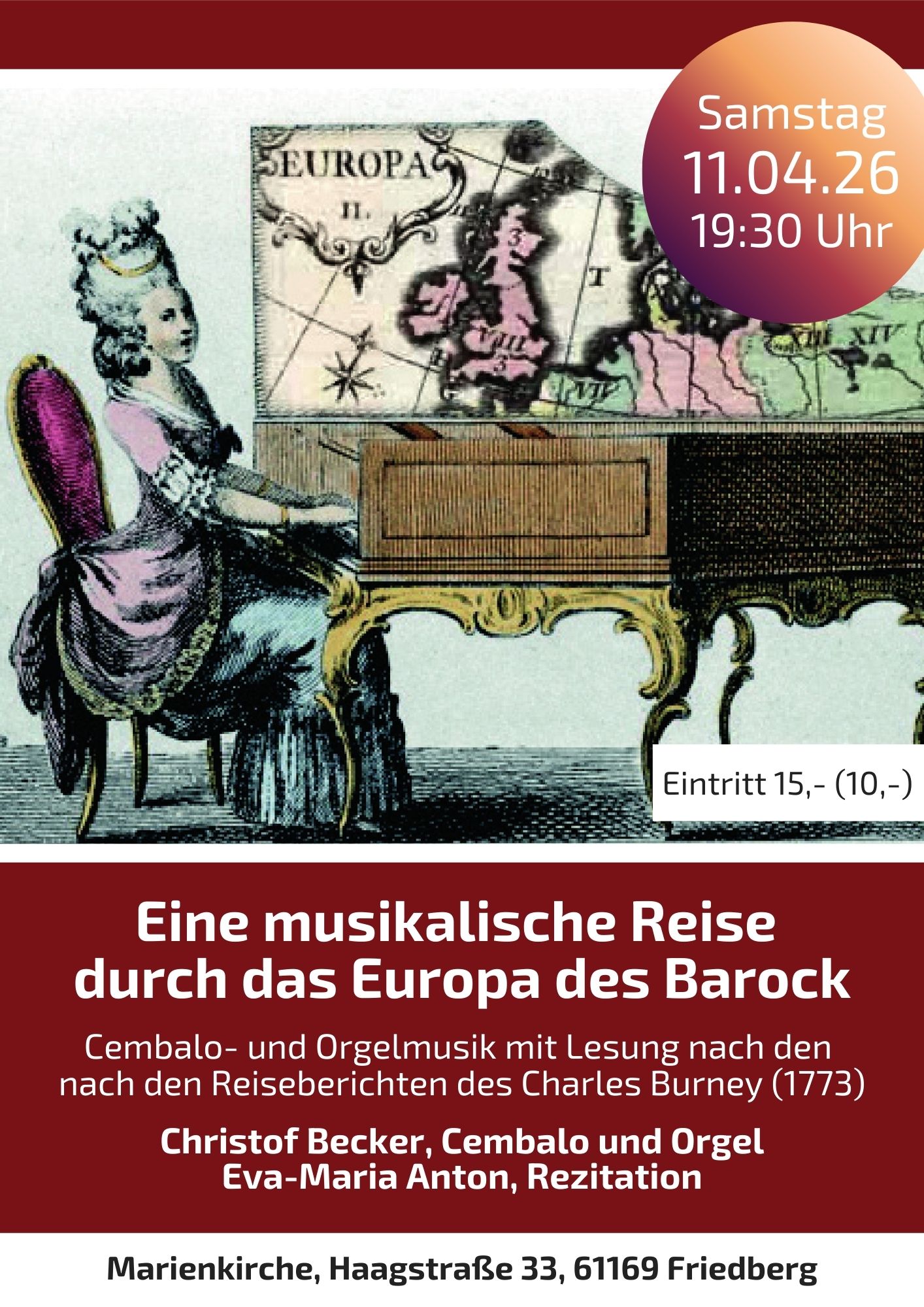 Am 11. April führen uns Marienstiftskantor Christof Becker aus Lich (Cembalo und Orgel) sowie Regionalkantorin Eva-Maria Anton aus Bad Nauheim (Rezitation) auf den Spuren des englischen Musikgelehrten Charles Burney quer durch den Kontinent.