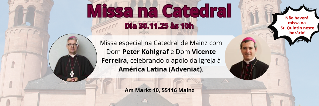 Ab dem 29. Januar 2023 finden alle Gottesdienste in portugiesischer Sprache in der Regel immer Sonntags um 10:00 in der Pfarrkirche St. Quintin statt (Quintinsstraße 5, 55116 Mainz).