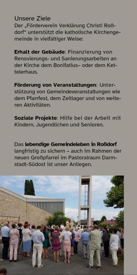 Die katholische Kirchengemeinde Verklärung Christi in Roßdorf hat einen wichtigen Schritt unternommen, um die Zukunft der Gemeinde und ihrer Kirche aktiv zu sichern. Mit der Gründung des Fördervereins Verklärung Christi wollen wir dazu beitragen, dass die kirchliche Arbeit hier vor Ort langfristig (und auch nach der Gründung der neuen Großpfarrei im Pastoralraum Darmstadt-Südost) weitergeht.