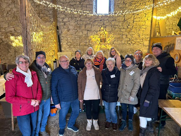 Einen Großteil dieser Mittel erwirtschaften wir auf dem Weihnachtsmarkt, der für uns und unsere Besucher ein Highlight darstellt. Dieses Jahr konnten wir mit wunderschönen eigens hergestellten Advents- und Türkränzen erfreuen. Die Nachfrage war großartig. Ebenso gab es sogar Engpässe bei den weihnachtlichen Holzbastelarbeiten. Unsere Hobbykünstler haben sogar noch Nachbestellungen mit nach Hause genommen. Liebevoll hergestellte Geschenke aus unterschiedlichsten Materialien, selbst hergestellte Marmelade und Likör aus den Früchten unseres Gartens, daneben die leckeren Biomandeln, die Schmalzbrote, der Eierwein und der Roséglühwein sorgten für ein vielfältiges, kreatives Angebot für alle Sinne. Wir danken allen, die ihren Wareneinsatz und ihre Zeit gespendet haben, besonders der Familie Stauder für die Eierspende. Gemeinsam mit unseren evangelischen Mitchristen organisieren wir den Weihnachtsmarkt nun schon das 3. Jahr und wir genießen die tolle Gemeinschaft und die zahlreichen Gäste, die sich in der heimeligen Pfarrscheune gerne aufhalten.