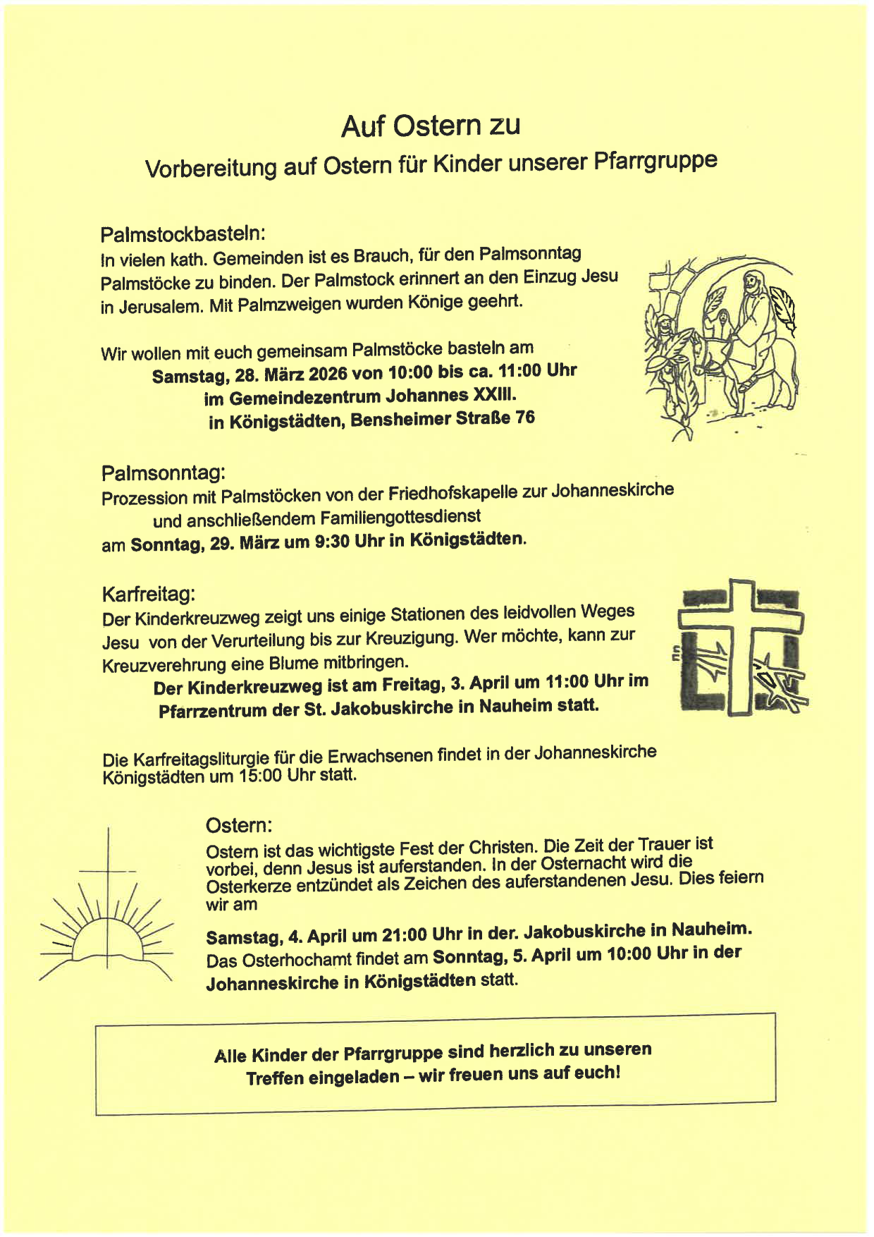 Die Vorbereitung zur Erstkommunion 2026 beginnt Mitte September 2025. Eingeladen sind alle Kinder, die dann die dritte Klasse besuchen. ...