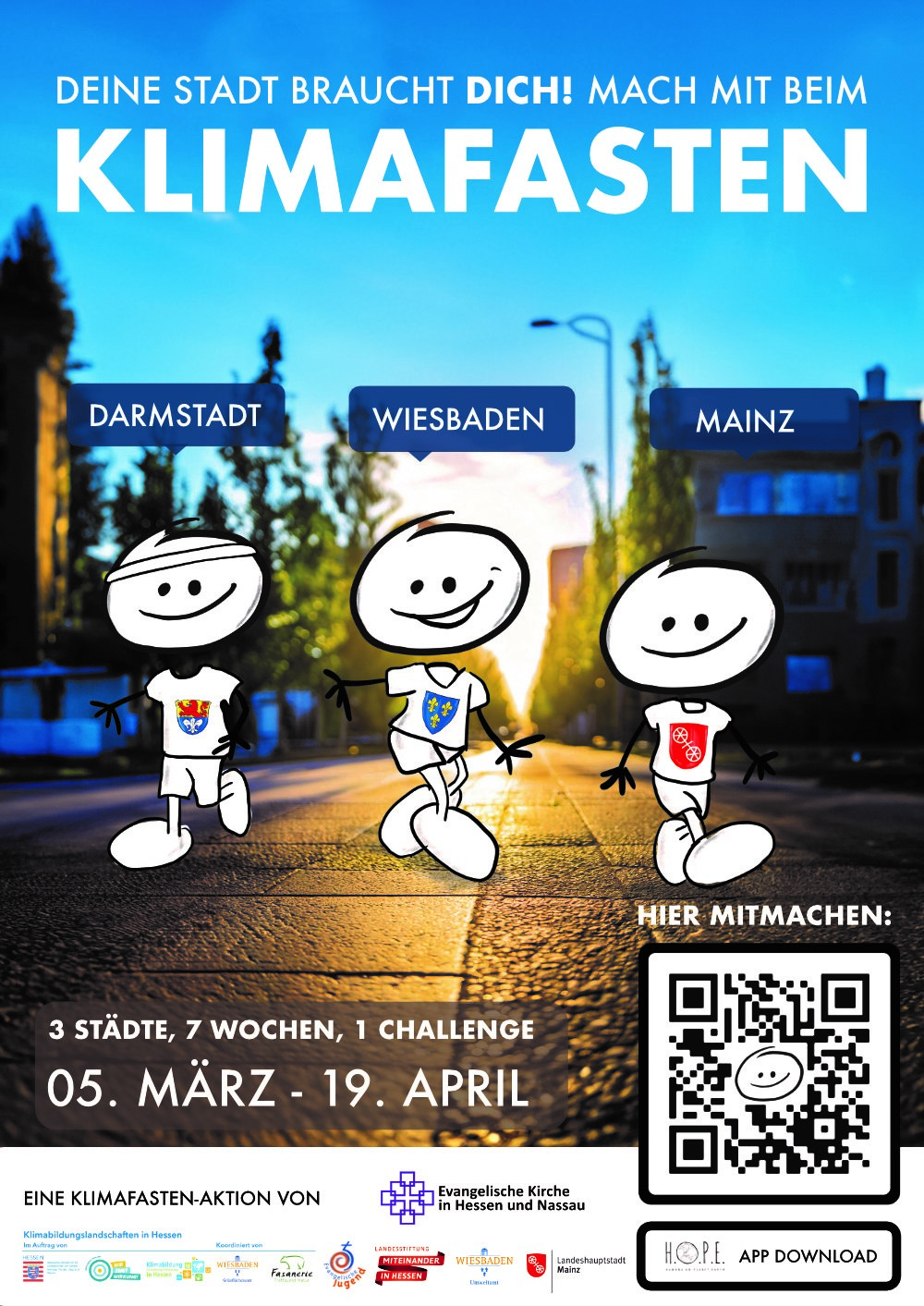 Für das Rhein-Main-Gebiet gibt es darüber hinaus in diesem Jahr eine besondere Fastenaktion. Am Aschermittwoch, den 5. März 2025, startet das Klimafasten – eine ökumenische Fastenaktion, für Klimaschutz und Klimagerechtigkeit. Die Städte Mainz, Wiesbaden und Darmstadt treten in den sieben Wochen vor Ostern in einer digitalen Klimachallenge gegeneinander an. Initiiert hat die Aktion die evangelische Kirche, die Städte sind dabei Partner und Unterstützer der Aktion. Die Klimaschutz-App des Wiesbadener Start-ups H.O.P.E. führt die Teilnehmenden spielerisch an das Thema Klimaschutz heran.