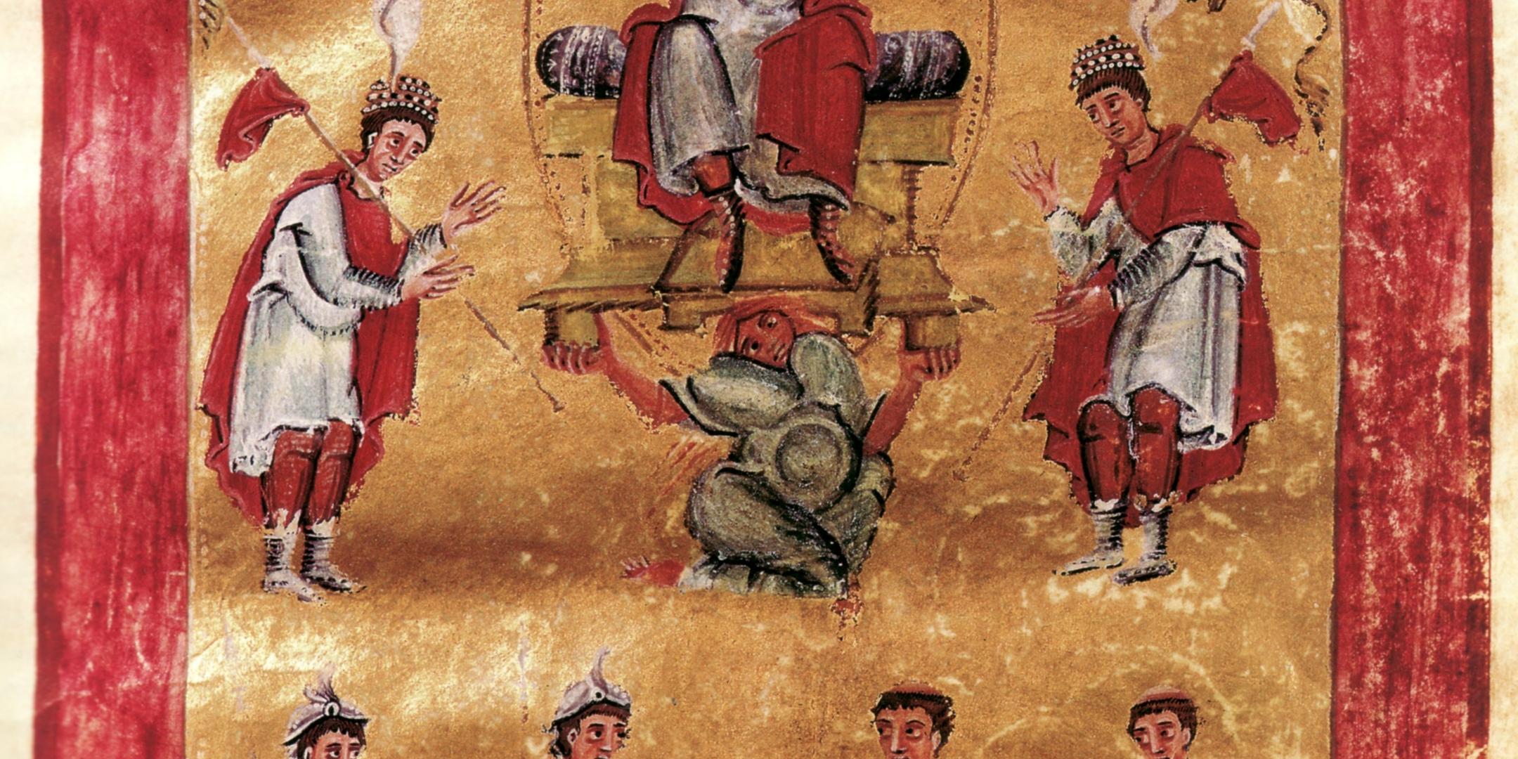 Abbildung: Darstellung Ottos III. aus dem Aachener Liuthar-Evangeliar, fol. 16r. Fotonachweis: Wikipedia allemande, Gemeinfrei, https://commons.wikimedia.org/w/index.php?curid=3953899