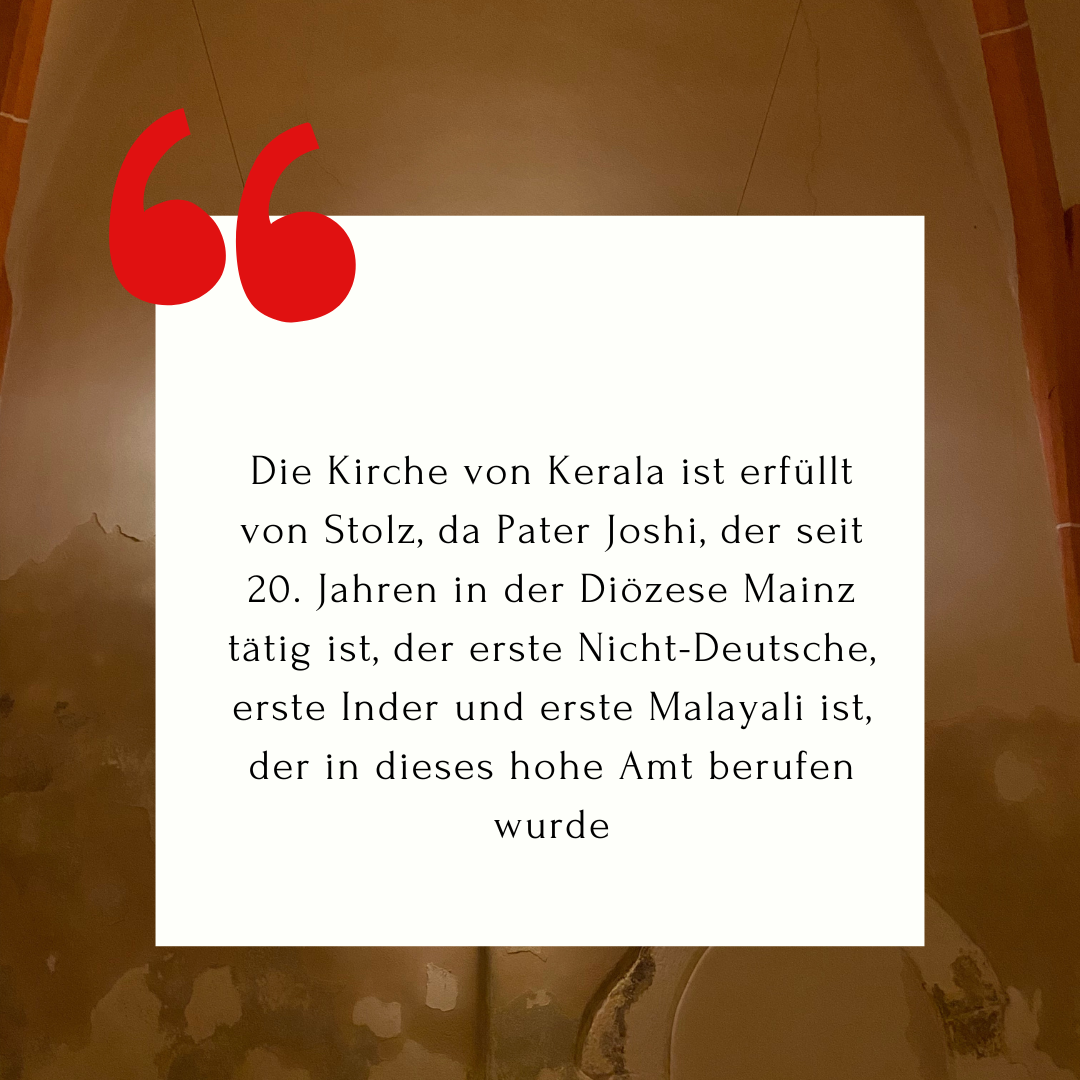 Die Weihe erfolgt im Mainzer Dom St. Martin (einer der drei Kaiserdome neben Speyer und Worms) um 15:00 Uhr durch den Mainzer Bischof Peter Kohlgraf, mit Unterstützung des Freiburger Erzbischofs Stephan Burger und Bischof Wilmar Santin O.Carm aus Brasilien. Die Kirche von Kerala ist erfüllt von Stolz, da Pater Joshi, der seit 20. Jahren in der Diözese Mainz tätig ist, der erste Nicht-Deutsche, erste Inder und erste Malayali ist, der in dieses hohe Amt berufen wurde. Nach verdienstvoller Arbeit als Jugendseelsorger, Pfarrer, Dekan und Referent im Ordinariat erreicht ihn im Alter von 48 Jahren die Bischofswürde. Diese Ausgabe von Sathyadeepam präsentiert ein Interview mit dem ernannten Bischof, geführt von Fr. Dr. Mathew Pittappillil, einem Priester der Diözese Kothamangalam, der ebenfalls in Mainz tätig ist.